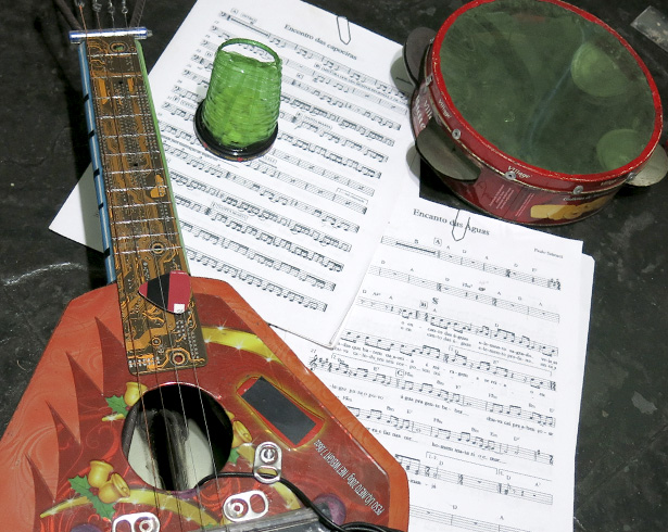 The musical instruments used follow an aesthetic line of reusing everyday materials, except those used in conventional instruments.